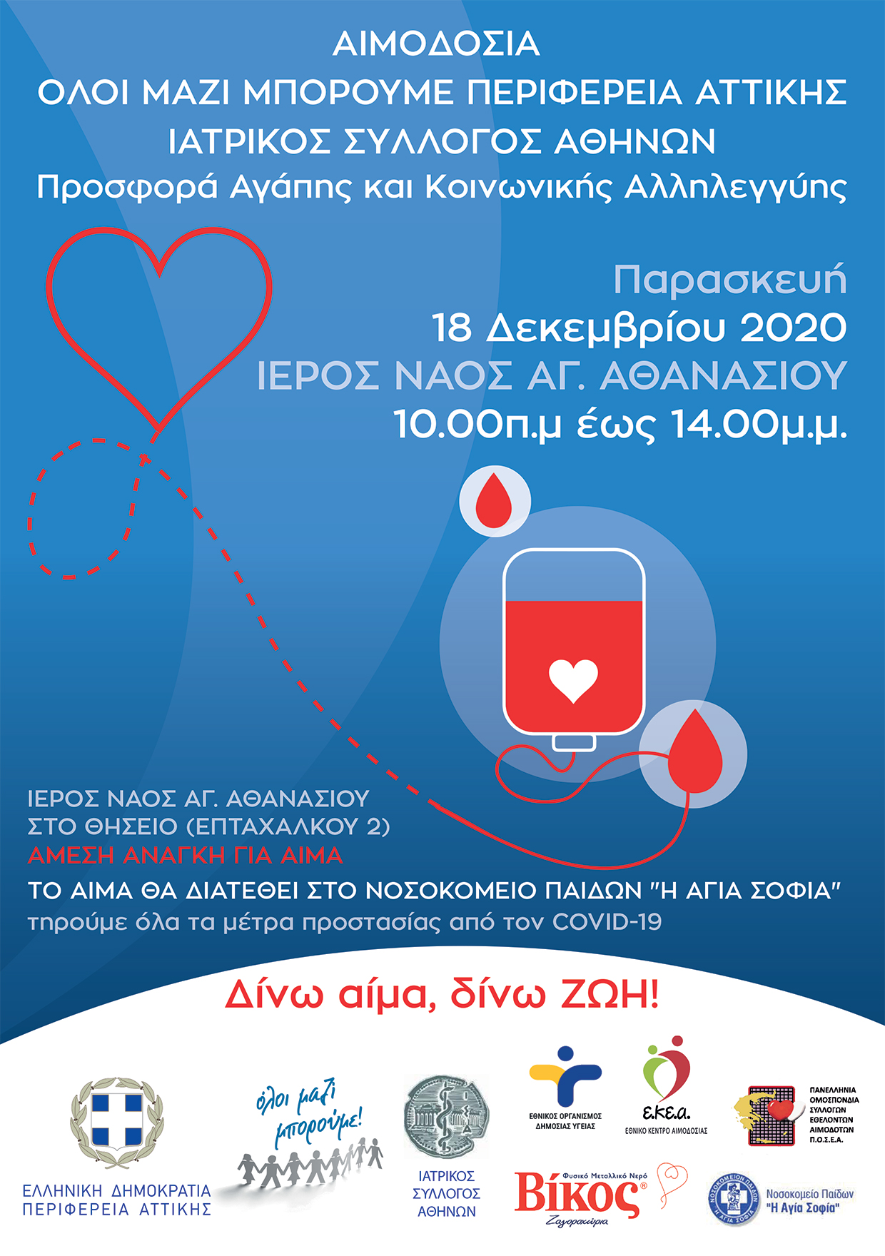 Γ. Πατούλης: «Αποτελεί χρέος όλων μας να συμβάλλουμε στην προσπάθεια ενίσχυσης της τράπεζας αίματος του Νοσοκομείου Παίδων «Η Αγία Σοφία». Η έμπρακτη βοήθεια μας προς τα μικρά παιδιά κατά την κρίσιμη περίοδο της πανδημίας αποτελεί ύψιστο αγαθό προσφοράς» Με πρωτοβουλία της Περιφέρειας Αττικής και με τη συνεργασία του «Όλοι Μαζί Μπορούμε» και του Ιατρικού Συλλόγου Αθηνών διοργανώνονται εθελοντικές αιμοδοσίες την Πέμπτη 17 και την Παρασκευή 18 Δεκεμβρίου. Οι δράσεις πραγματοποιούνται προκειμένου να καλυφθούν οι αυξημένες ανάγκες του νοσοκομείου Παίδων «Η Αγία Σοφία». Η εθελοντική αιμοδοσία της Πέμπτης 17 Δεκεμβρίου θα πραγματοποιηθεί στον Ιερό Ναό Προφήτου Δανιήλ στο Μεταξουργείο (Λ. Αθηνών 17) από τις 10 π.μ. έως τις 2 μ.μ., ενώ η δεύτερη την Παρασκευή 18 Δεκεμβρίου θα πραγματοποιηθεί στον Ιερό ναό Αγίου Αθανασίου στη Θησείο (Επταχάλκου 2) από τις 10 π.μ. έως τις 2 μ.μ.. Την δράση υποστηρίζουν επίσης ο Εθνικός Οργανισμός Δημόσιας Υγείας, το Εθνικό Κέντρο Αιμοδοσίας, το Νοσοκομείο Παίδων «Η Αγία Σοφία» και η Πανελλήνια Ομοσπονδία Εθελοντών Αιμοδοτών (ΠΟΣΕΑ). Τον συντονισμό από την πλευρά της Περιφέρειας Αττικής έχει η ειδική συνεργάτης Άθλησης του Περιφερειάρχη Αττικής Χ. Γαλανοπούλου. Σε μήνυμα του ο Πρόεδρος του Ι.Σ.Α. επισημαίνει τα εξής: «Αποτελεί χρέος όλων μας να συμβάλλουμε στην προσπάθεια ενίσχυσης της τράπεζας αίματος του Νοσοκομείου Παίδων «Η Αγία Σοφία». Η έμπρακτη βοήθεια μας προς τα μικρά παιδιά κατά την κρίσιμη περίοδο της πανδημίας αποτελεί ύψιστο αγαθό προσφοράς. Από την πρώτη στιγμή που ενημερώθηκα για τις ελλείψεις που υπάρχουν ζήτησα από τους συνεργάτες μου να υπάρξει άμεση κινητοποίηση προκειμένουτο ιατρικό και νοσηλευτικό προσωπικό, να μπορεί να ανταποκριθεί στις ιδιαίτερα αυξημένες ανάγκες των παιδιών, που χρειάζονται μετάγγιση αίματος. Καλούμε, όσους μπορούν να δώσουν αίμα, να συμμετέχουν στην εθελοντική αιμοδοσία. Λίγα λεπτά είναι αρκετά για να συμβάλουμε σε μια εθνική προσπάθεια». Τρόπος μετακίνησης των εθελοντών αιμοδοτών. Σύμφωνα με ανακοίνωση που έχει εκδώσει η ΠΟΣΕΑ σχετικά με τον τρόπο μετακίνησης των εθελοντών αιμοδοτών, επισημαίνονται τα εξής: «Μέχρι να ανακοινωθεί επίσημα από την Πολιτική Προστασία ο σχετικός αριθμός του SMS για την μετακίνηση με σκοπό την προσφορά αίματος, πλάσματος ή αιμοπεταλίων, οι Εθελοντές Αιμοδότες θα πρέπει να έχουν μαζί τους την αστυνομική τους ταυτότητα ή άλλο δημόσιο έγγραφο που να αποδεικνύεται η ταυτοπροσωπία και μια απλή ιδιόχειρη ατομική και ενυπόγραφη δήλωση, που να αναφέρει ότι μετακινούνται για να προσφέρουν εθελοντικά αίμα, στην περιοχή που διενεργείται η Εθελοντική Αιμοδοσία ή από Συλλόγους Εθελοντών Αιμοδοτών ή από άλλον Φορέα, τον ακριβή τόπο και την ώρα που πραγματοποιείται η Αιμοδοσία. Επίσης μπορούν να ζητούν και Βεβαίωση από την Υπηρεσία Αιμοδοσίας που διενεργεί την αιμοληψία για την επιστροφή τους στην οικία τους». ΓΡΑΦΕΙΟ ΤΥΠΟΥ ΙΣΑ |