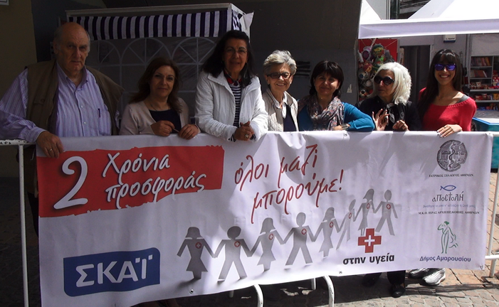 Στην αλληλεγγύη της πανανθρώπινης προσφοράς φαρμάκων από εκατομμύρια ανώνυμους πολίτες, με αφορμή τη συμπλήρωση 2 χρόνων της δράσης του ΣΚΑΙ Όλοι μαζί μπορούμε και στην Υγεία, αφιέρωσαν τη σημερινή συγκέντρωση φαρμάκων ο Ιατρικός Σύλλογος Αθηνών, η ΑΠΟΣΤΟΛΗ της Ιεράς Αρχιεπισκοπής Αθηνών ο ραδιοτηλεοπτικός σταθμός ΣΚΑΙ και ο Δήμος Αμαρουσίου. Μήνυμα συνέχισης της κοινωνικής ευαισθησίας και ανθρωπιάς όλων των συνοδοιπόρων του Ιατρείου Κοινωνικής Αποστολής, μέσα από το Όλοι μαζί Μπορούμε, έδωσε ο Πρόεδρος του Ιατρικού Συλλόγου Αθηνών και Δήμαρχος Αμαρουσίου Γιώργος Πατούλης από την Πλατεία ΗΣΑΠ στη σημερινή συγκέντρωση φαρμάκων στο Μαρούσι, λέγοντας: «Ένα μεγάλο ευχαριστώ στους συνοδοιπόρους αυτής της προσπάθειας, που μέσα σε 2 χρόνια, έγινε, με τη συμμετοχή χιλιάδων ανώνυμων πολιτών, πανελλαδικό θεσμός αλληλεγγύης και εθελοντισμού. Είμαστε σήμερα εδω, στο Μαρούσι από όπου ξεκινήσαμε 2 χρόνια πριν τη συλλογή φαρμάκων, μαζί, μέσα από τη δράση του ΣΚΑΙ Όλοι μαζί μπορούμε και στην Υγεία, με τον Ιατρικό Σύλλογο Αθηνών, την ΑΠΟΣΤΟΛΗ της Ιεράς Αρχιεπισκοπής Αθηνών. Τα φάρμακα που συγκεντρώσαμε, μετά από έναν ενδελεχή έλεγχο καταλληλότητας και ασφαλείας, χορηγήθηκαν δωρεάν, βάσει ιατρικής συνταγής σε ανασφάλιστους ασθενείς που δε θα μπορούσαν να τα αγοράσουν. Στο Ιατρείο Κοινωνικής Αποστολής καθημερινά προσέρχονται εκατοντάδες άρρωστοι, πολλοί απο τους οποίους λαμβάνουν χρονιές αγωγές. Χάρη στη συμμετοχή του κόσμου και στην ανεκτίμητη προσφορά των χιλιάδων φαρμάκων τους κάθε Σάββατο, και παράλληλα, χάρη στις σπουδαίες χορηγίες των Φαρμακευτικών Εταιρειών είμαστε σε θέση να μπορούμε να καλύπτουμε δωρεάν». Στην πλατεία ΗΣΑΠ στο Μαρούσι συγκεντρώθηκαν από τη σημερινή κατάθεση του μαρουσσιώτικου λαού 20 μεγάλοι σάκοι με φαρμακευτικό και υγειονομικό υλικό, μεταξύ του οποίου υπήρχαν πολύ υψηλού κόστους χημιοθεραπευτικά φάρμακα για καρκινοπαθείς και ινσουλίνες απαραίτητες για σακχαροδιαβητικούς. Τα φάρμακα παραδόθηκαν στο Κοινωνικό φαρμακείο του Δήμου Αμαρουσίου για να καλύψουν τις θεραπευτικές ανάγκες των άπορων, ανασφάλιστων και φτωχών αρρώστων που δε μπορούν να τα αγοράσουν. Μέσα στα δύο χρόνια της δράσης, το Ιατρείο Κοινωνικής Αποστολής του Ιατρικού Συλλόγου Αθηνών και της ΑΠΟΣΤΟΛΗΣ, συγκέντρωσαν 900.000 φάρμακα για ανασφάλιστους και άπορους ασθενείς.. Μεταξύ αυτών, πολλά ήταν και τα εξειδικευμένα φάρμακα υψηλού κόστους για χρόνιους ασθενείς, χωρίς τα οποία οι άρρωστοι θα πέθαιναν. Παράλληλα, επεκταθήκαμε σε όλη την Ελλάδα και ιδρύσαμε Κοινωνικά Φαρμακεία, φτάσαμε μέσα από 20 οδοιπορικά υγείας του Ιατρείου Κοινωνικής Αποστολής σε 48 απομακρυσμένες περιοχές της Ελλάδας και προσφέραμε, μέσα στη διετία μέσα από το όλοι μαζί μπορούμε του ΣΚΑΙ, 600.000 δωρεάν φάρμακα στην Αττική και στις παραμεθόριες και απομακρυσμένες περιοχές, στηρίζοντας τα 11 παραρτήματα του Ιατρείου ανά την Ελλάδα, 43 Κοινωνικά Φαρμακεία, 35 δήμους της Αττικής, 52 δήμους της Περιφέρειας, 26 Μητροπόλεις και 30 ενορίες της Ιερας Αρχιεπισκοπής Αθηνών, καθώς επίσης και 18 ιδρύματα, 5 άσυλα και πολλούς άλλους φορείς. Από την πλευρά του ο Διευθυντής της ΑΠΟΣΤΟΛΗΣ της Ιεράς Αρχιεπισκοπής Αθηνών Κωστής Δήμτσας, δήλωσε: «Με την ευλογία του Μακαριωτατου Αρχιεπισκόπου μας κκ Ιερωνύμου του Β και τη συμμετοχή όλου του κόσμου, καταφέραμε να ανταποκριθούμε στην πρωταρχική μας επι