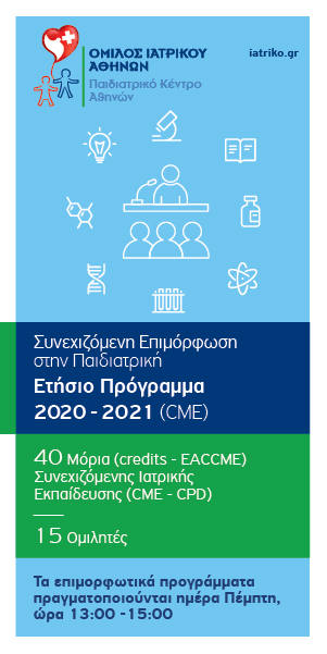 7o Ετήσιο πρόγραμμα της Συνεχιζόμενης Ιατρικής Επιμόρφωσης στην Παιδιατρική του Παιδιατρικού Κέντρου Αθηνών του Ομίλου Ιατρικού Αθηνών, τα οποία θα πραγματοποιούνται από τον Οκτώβριο 2020 μέχρι τον Ιούλιο 2021, διαδικτυακά – για την αφίσα πατήστε εδώ -για το πρόγραμμα πατήστε εδώ – για περισσότερα πατήστε εδώ