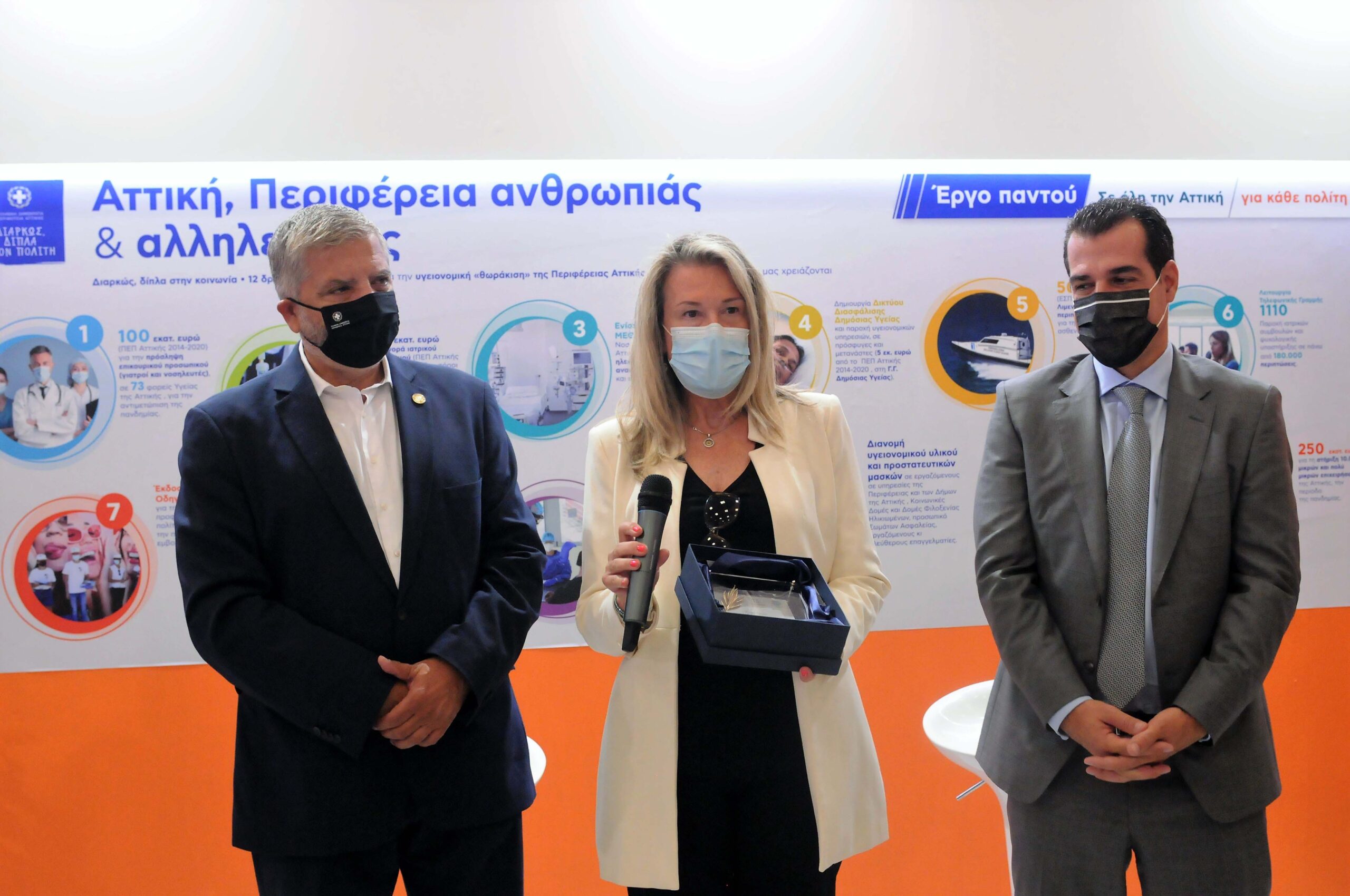 Γ. Πατούλης: «Τιμούμε τους πραγματικούς πρωταγωνιστές αυτής της μάχης-Επιβραβεύουμε τη διάθεση εθελοντικής ανιδιοτελούς προσφοράς στο συνάνθρωπο» Στο πλαίσιο της διοργάνωσης της 85ης Διεθνούς Έκθεσης Θεσσαλονίκης σε ειδική τιμητική εκδήλωση που πραγματοποιήθηκε στο Περίπτερο της Περιφέρειας Αττικής, με προσκεκλημένο τον Υπ. Υγείας Αθ. Πλεύρη, ο Πρόεδρος του ΙΣΑ και Περιφερειάρχης Αττικής Γ. Πατούλης και ο Υπουργός απένειμαν βραβεία σε Ιατρούς και νοσηλευτές που συνέδραμαν εθελοντικά στις δράσεις της Περιφέρειας για την καταπολέμηση της πανδημίας, μέσω του Κέντρου Επιχειρήσεων (ΚΕΠΙΧ) που συστάθηκε από την Περιφέρεια και τον Ιατρικό Σύλλογο Αθηνών.
