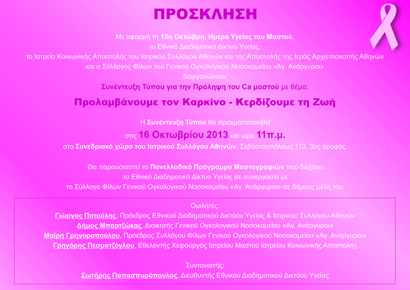 Τέλος ο κ. Πατούλης, δήλωσε οι ανωτέρω φορείς διοργανώνουν μεγάλη Συνέντευξη τύπου με αφορμή την 15η Οκτώβρη -Ημέρα Υγείας του Μαστου, στις 16 Οκτωβριου και ώρα 11:00π.μ. στα γραφεία του Ιατρικού Συλλόγου Αθηνών, για να παρουσιάσουν τα αποτελέσματα του Προγράμματος Μαστογραφιών, στα πλαίσια της εκστρατείας του Εθνικού Διαδημοτικού Δικτύου υγείας «Προλαμβάνουμε τον καρκίνο – Κερδίζουμε τη ζωή»