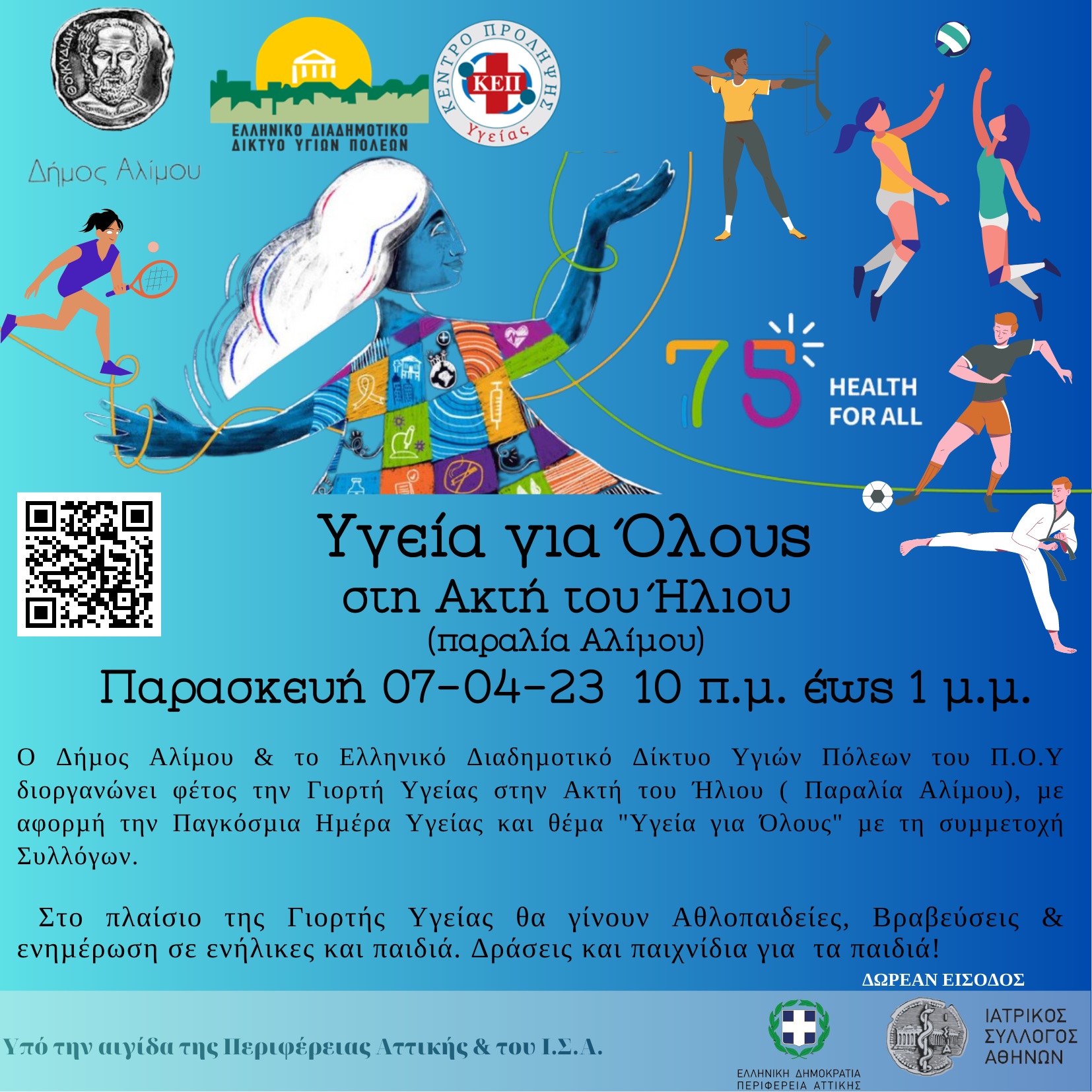 Δράση «Υγεία για Όλους» από την Περιφέρεια Αττικής και τον Δήμο Αλίμου για την Παγκόσμια Ημέρα Υγείας – Συνδιοργανωτές το Ελληνικό Διαδημοτικό Δίκτυο Υγιών Πόλεων (ΕΔΔΥΠΠΥ), ο ΙΣΑ και τα ΚΕΠ Υγείας