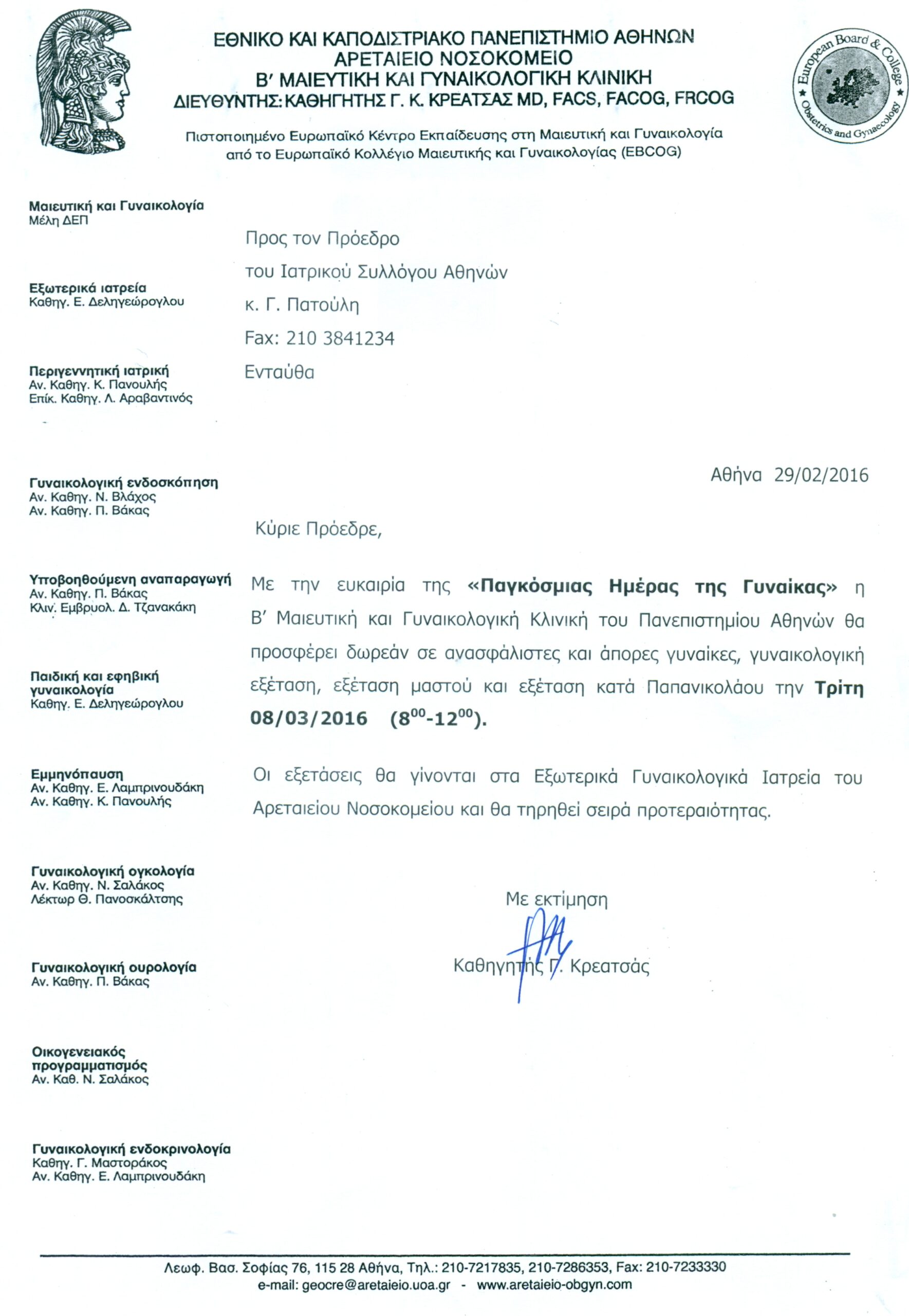 Δωρεάν γυναικολογικές εξετάσεις σε ανασφάλιστες και άπορες γυναίκες από το Αρεταίειο Νοσοκομείο στις 8-3-2016