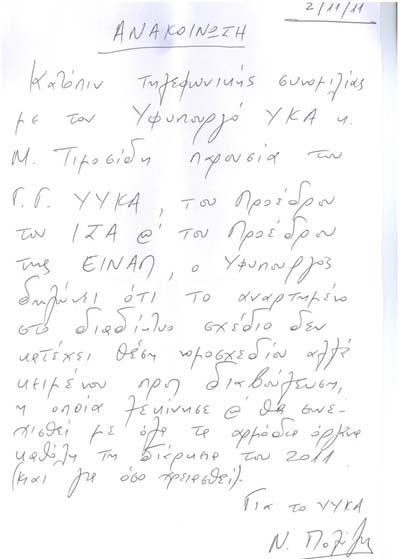 Ακολούθως απεχώρησε και μετά επικοινωνία του με τον Υφυπουργό κο Τιμοσίδη μας ενεχείρησε ΑΝΑΚΟΙΝΩΣΗ του με την οποία αναγνωρίζει ότι το ανηρτημένο στο διαδίκτυο Σχέδιο δεν αποτελεί Νομοσχέδιο αλλά απλά κείμενο διαβούλευσης. Ο διάλογος με τους ενδιαφερόμενους φορείς θα διαρκέσει τουλάχιστον μέχρι το τέλος του 2011 και αν χρειαστεί και περισσότερο.
