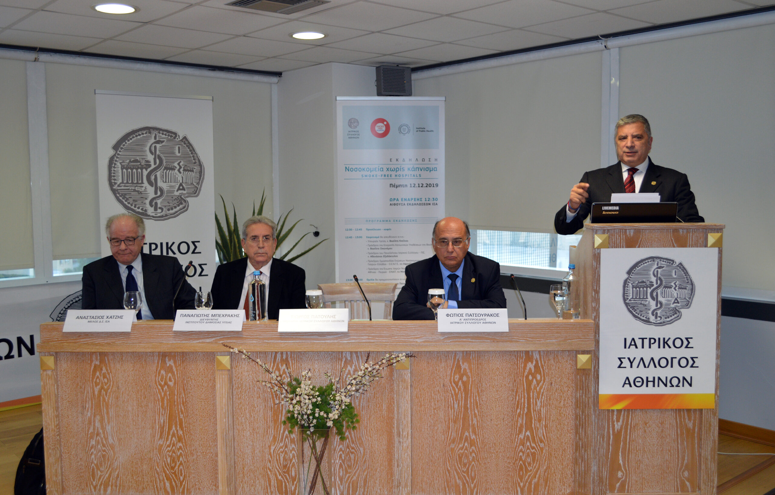Η μετατροπή κάθε υγειονομικής δομής της χώρας, σε ενεργό κέντρο επιστημονικής καταπολέμησης του καπνίσματος ήταν ο στόχος της επιστημονικής εκδήλωσης, με θέμα «Νοσοκομεία χωρίς κάπνισμα (Smoke Free Hospitals)» που διοργάνωσε την Πέμπτη 12/12/19, ο Ιατρικός Σύλλογος Αθηνών, σε συνεργασία με το Ινστιτούτο Δημόσιας Υγείας, στην αίθουσα εκδηλώσεων του Συλλόγου.