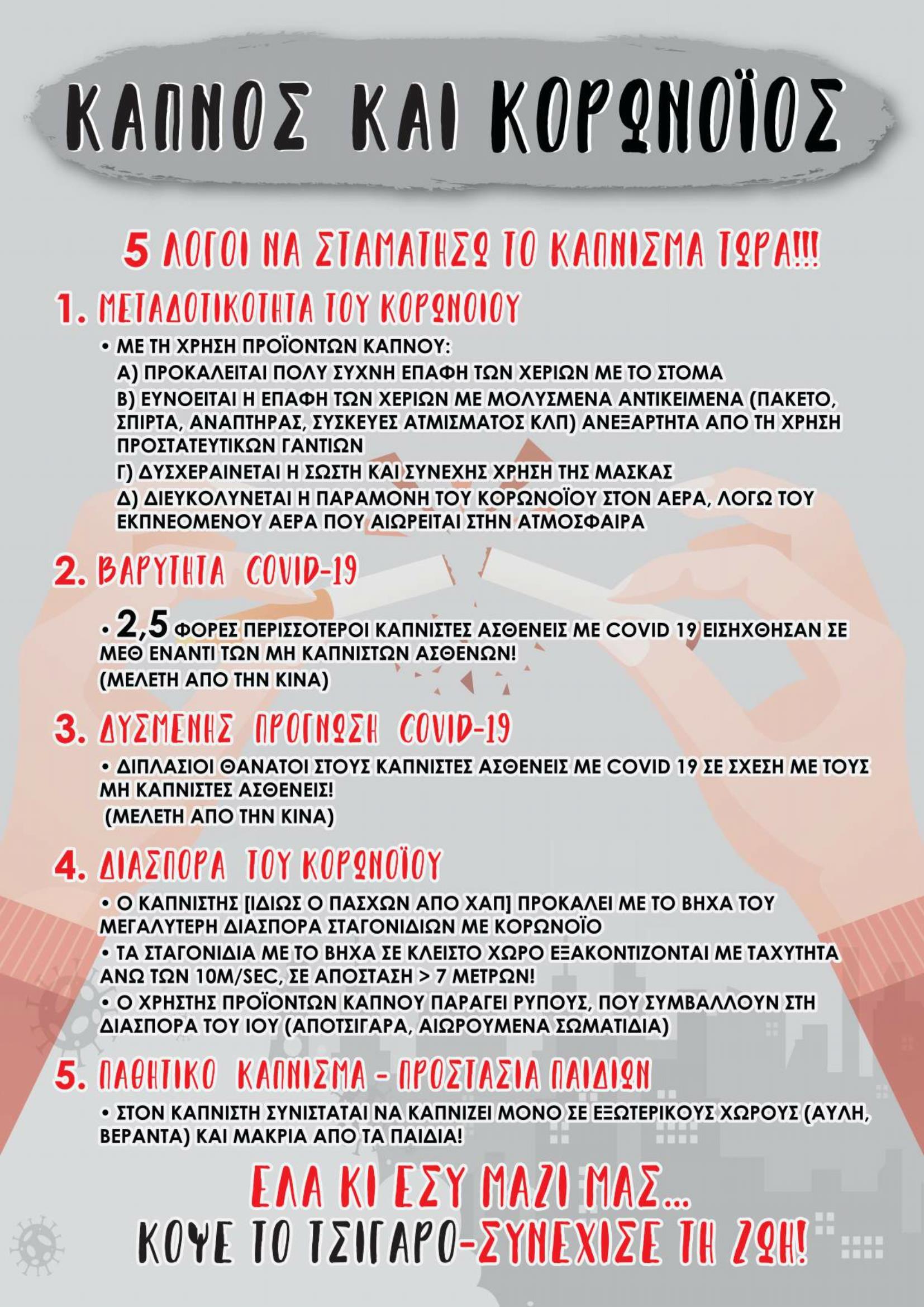 Το δεύτερο φυλλάδιο αναφέρεται στη σύνδεση του καπνίσματος με τις σοβαρές επιπλοκές της Covid-19 και καλεί τους πολίτες να διακόψουν το κάπνισμα.