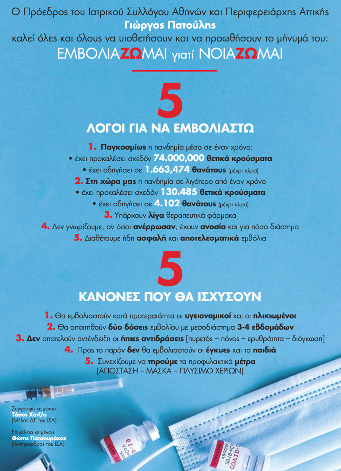 Το ένα φυλλάδιο έχει τίτλο ΕμβολιάΖΩμαι Γιατί ΝοιάΖΩμαι και μεταφέρει το μήνυμα του Προέδρου του ΙΣΑ και Περιφερειάρχη Αττικής Γ. Πατούλη, που καλεί τους πολίτες να υιοθετήσουν και να προωθήσουν το μήνυμα για τον εμβολιασμό για τον Sars-Cοv-2. Μάλιστα, επισημαίνει 5 λόγους, για τους οποίους οι πολίτες πρέπει να κάνουν το εμβόλιο.