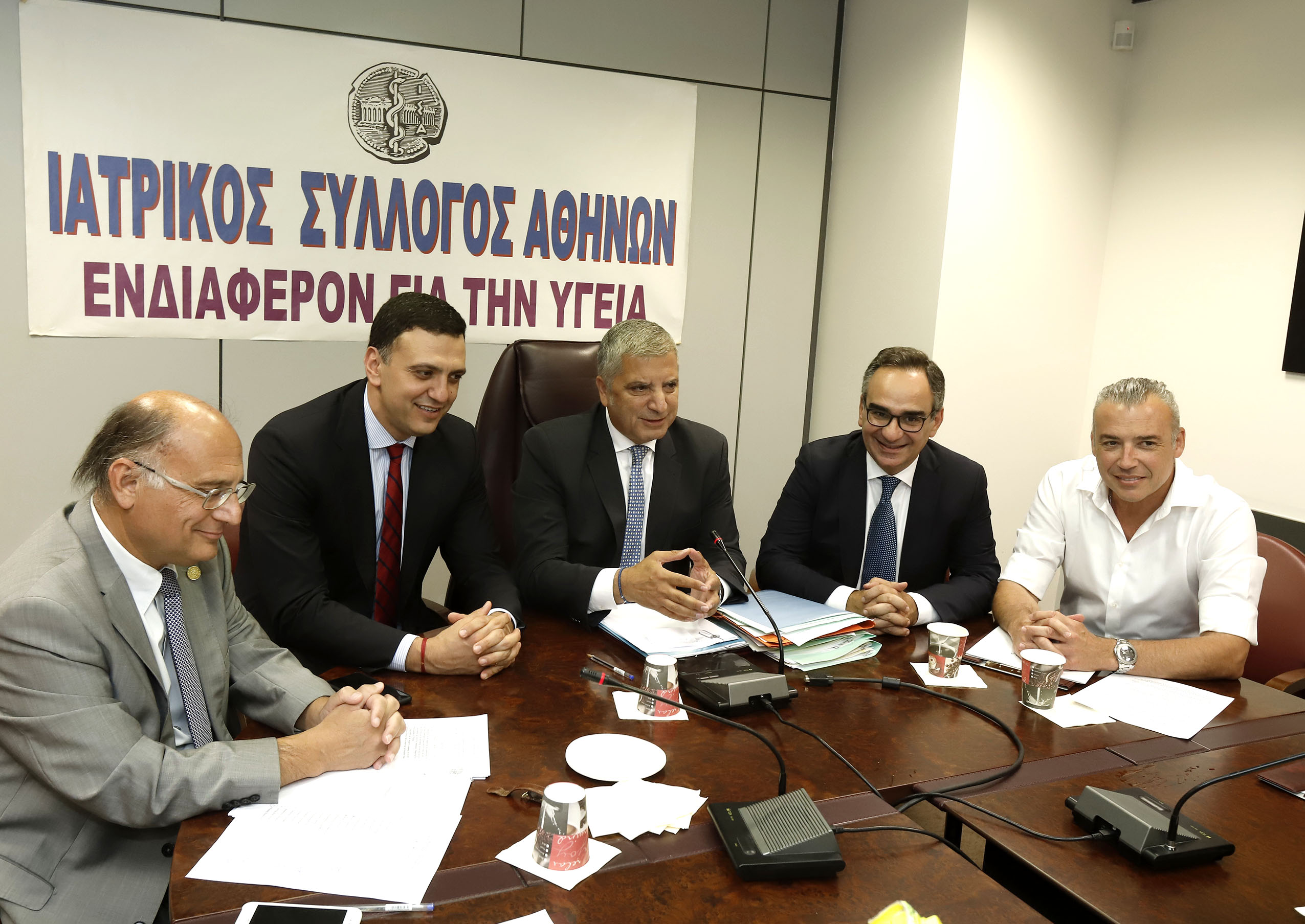 Τον Ιατρικό Σύλλογο Αθηνών επισκέφθηκαν σήμερα ο Υπουργός Υγείας κ. Βασίλης Κικίλιας και ο Υφυπουργός Υγείας κ. Βασίλης Κοντοζαμάνης, οι οποίοι ενημερώθηκαν από τον Πρόεδρο κ. Γ. Πατούλη και το Δ.Σ του ΙΣΑ, για με τα κρίσιμα ζητήματα που αφορούν τη Δημόσια υγεία και τον ιατρικό κόσμο. «Είμαι ιδιαίτερα συγκινημένος που επισκέπτομαι τον ΙΣΑ καθώς οι συνάδελφοί μου και γενικότερα όλο το έμψυχο δυναμικό του ΕΣΥ αποτελεί το θησαυρό που θα αξιοποιήσουμε στην χάραξη μιας πολιτικής που θα έχει επίκεντρο τον άνθρωπο. Τα προβλήματα είναι τεράστια, ωστόσο με στενή συνεργασία και κοινή προσπάθεια, θα πετυχαίνουμε καθημερινές μικρές και μεγαλύτερες νίκες που θα απαλύνουν τον ανθρώπινο πόνο.» Ο Υφυπουργός Υγείας κ. Βασίλης Κοντοζαμάνης, επεσήμανε τα εξής: «Είμαστε καλά προετοιμασμένοι και έχουμε συγκεκριμένο και καλά μελετημένο πρόγραμμα που θα επιλύσει χρόνια προβλήματα και θα αλλάξει τα δεδομένα στο Σύστημα Υγείας. Η προσπάθεια είναι ομαδική και η συνεργασία με τους Φορείς θα συνεχιστεί και θα διευρυνθεί.» Από την πλευρά του, ο Πρόεδρος του ΙΣΑ κ. Γιώργος Πατούλης αφού καλωσόρισε την πολιτική ηγεσία του Υπουργείου Υγείας ,στο σπίτι των ιατρών της Αθήνας, τόνισε μεταξύ άλλων τα εξής: «Χαιρετίζουμε την επίσκεψη της πολιτικής ηγεσίας του Υπουργείου Υγείας, στο σπίτι των ιατρών της Αθήνας που σηματοδοτεί την επιστροφή στην κανονικότητα και το τέλος μιας «μαύρης περιόδου», κατά την οποία επιχειρήθηκε η φίμωση του ιατρικού κόσμου. Η επανεκκίνηση της χώρας, με την νέα κυβέρνηση ανοίγει και μια νέα σελίδα και για την υγεία. Ξεκινά μια στενή συνεργασία καθώς ο ΙΣΑ θα είναι αρωγός στη χάραξη της πολιτικής που θα είναι προς όφελος του ασθενή, της δημόσιας υγείας και του λειτουργού της υγείας» Στη συνέχεια το λόγο, πήραν τα μέλη του Δ.Σ. του ΙΣΑ, τα οποία του παρουσίασαν κρίσιμα ζητήματα που αφορούν τη δημόσια υγεία ενώ στην πολιτική ηγεσία του Υπουργείου Υγείας παραδόθηκε σχετικό υπόμνημα, με τις θέσεις του ΙΣΑ, σε βασικά ζητήματα όπως είναι τα εξής: