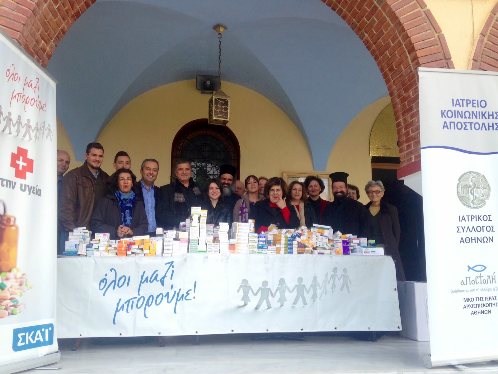Ολοκληρώθηκε με επιτυχία και σήμερα η δράση του Ιατρικού Συλλόγου Αθηνών και του Φιλανθρωπικού οργανισμού ΑΠΟΣΤΟΛΗ της Ιεράς Αρχιεπισκοπής Αθηνών «Όλοι μαζί μπορούμε και στην Υγεία» του ραδιοτηλεοπτικού Σταθμού ΣΚΑΙ, όπου στον ιερό Ναό Αγίου Γεωργίου Παπάγου συγκεντρώθηκαν 19 μεγάλοι σάκοι με φαρμακευτικό και υγειονομικό υλικό. Τη διαδικασία για τη συλλογή φαρμάκων επιμελήθηκαν οι εθελοντές του Ιατρείου Κοινωνικής Αποστολής οι εθελοντές κυρία Μελιάδου , κ. Κονιδάρης, και η κ Παπαπροκοπίου. “Η προσέλευση των πολιτών στον Ιερό Ναό Αγίου Γεωργίου Παπάγου είναι συγκινητική και αυτή η αλυσίδα αλληλεγγύης μεγαλώνει. Υπήρξαν συμπολίτες μας που αγόραζαν τα φάρμακα για να τα διαθέσουν με ασφάλεια μέσα από το Ιατρείο κοινωνικής αποστολής στους ανασφάλιστους και απόρους συμπολίτες μας. Ένα μεγάλο ευχαριστώ σε όλους τους εθελοντές πολίτες, στους ιατρούς εθελοντές του ΙΣΑ για τη μεγάλη συμμετοχή τους στο “όλοι μαζι μπορούμε” αλλά και στο δήμαρχο Χολαργού- Παπάγου Ηλία Αποστολόπουλο για τη μεγάλη στήριξη του”, ανέφερε ο Πρόεδρος του ΙΣΑ κ. Πατούλης. « Είναι συγκινητική η ανταπόκριση του κόσμου και αυτό μας δίνει δύναμη και κουράγιο να συνεχίσουμε τον αγώνα μας με γνώμονα την ανακούφιση των φτωχών και άρρωστων συνανθρώπων μας. Επιτακτική ανάγκη προβάλλει να στηρίξουμε τους ανθρώπους που μας έχουν ανάγκη, που υποφέρουν και αντιμετωπίζουν πολλά προβλήματα στην υγεία τους», δήλωσε ο Γεν Διευθυντής της ΑΠΟΣΤΟΛΗΣ κος Δήμτσας Το Ιατρείο Κοινωνικής Αποστολής λειτουργεί στα γραφεία του Ιατρικού Συλλόγου Αθηνών, στην οδό Σεβαστουπόλεως 113, Δευτέρα-Παρασκευή, από τις 9.00 το πρωί έως τις 3. 00 το μεσημέρι. Δέχεται ασθενείς, οι οποίοι είναι ανασφάλιστοι. Εκεί, μπορούν να εξετάζονται και να παραλαμβάνουν τα φάρμακά τους. Προκειμένου να εξετασθούν, θα πρέπει να προσκομίζουν: 1)ταυτότητα ή διαβατήριο ή δίπλωμα οδήγησης, ώστε να αποδεικνύεται η ταυτότητά τους 2)Βιβλιάριο Υγείας το οποίο έχει λήξει 3) Κάρτα ανεργίας, η οποία επίσης έχει λήξει. Για το Ιατρείο Κοινωνικής Αποστολής Ο Πρόεδρος του Ι.Σ.Α. Ο Γεν. Διευθυντής της ΜΚΟ «ΑΠΟΣΤΟΛΗ» Γιώργος Πατούλης Κωνσταντίνος Δήμτσας