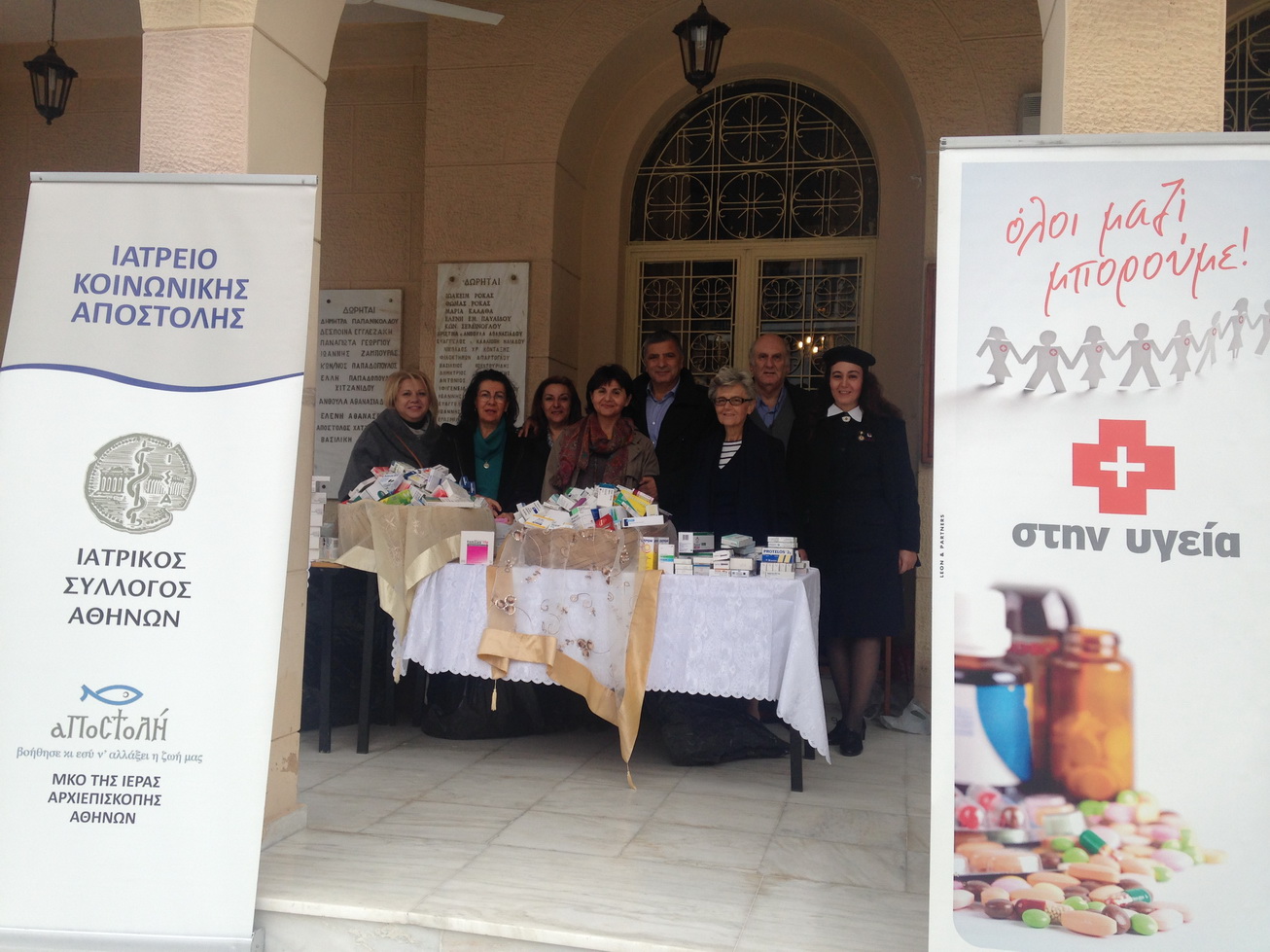 Συλλογή 30 μεγάλων σακουλών φαρμάκων και υγειονομικού υλικού πραγματοποιήθηκε στην εκκλησία της Αγίας Παρασκευής στη Νέα Σμύρνη με τη συμμετοχή του Δήμου Νέας Σμύρνης και της τοπικής οργάνωσης Ερυθρού Σταύρου. Πολύτιμη η συμμετοχή των εθελοντών ιατρών του ιατρείου κοινωνικής αποστολής και του Ερυθρού Σταυρού. Τη διαδικασία για τη συλλογή φαρμάκων οι εθελοντές του Ιατρείου Κοινωνικής Αποστολής και την εποπτεία οι εθελοντές κυρία Μελιάδου , κ. Κονιδάρης, και η κ Παπαπροκοπίου “Πάλι η προσφορά του κόσμου στο συνάνθρωπο ήταν συγκινητική! Ο ανθρώπινος πόνος απαλύνεται με την αλληλεγγύη και την αγάπη για τον συμπολίτη μας. Ευχαριστώ θερμά όλους τους πολίτες που συνέβαλαν στη συλλογή φαρμάκων, το δήμο Νέας Σμύρνης , τη τοπική του Ερυθρού Σταύρου “, ανέφερε ο Πρόεδρος του ΙΣΑ κ. Πατούλης. « Είναι συγκινητική η ανταπόκριση του κόσμου και αυτό μας δίνει δύναμη και κουράγιο να συνεχίσουμε τον αγώνα μας με γνώμονα την ανακούφιση των φτωχών και άρρωστων συνανθρώπων μας. Επιτακτική ανάγκη προβάλλει να στηρίξουμε τους ανθρώπους που μας έχουν ανάγκη, που υποφέρουν και αντιμετωπίζουν πολλά προβλήματα στην υγεία τους», δήλωσε ο Γεν Διευθυντής της ΑΠΟΣΤΟΛΗΣ κος Δήμτσας Το Ιατρείο Κοινωνικής Αποστολής λειτουργεί στα γραφεία του Ιατρικού Συλλόγου Αθηνών, στην οδό Σεβαστουπόλεως 113, Δευτέρα-Παρασκευή, από τις 9.00 το πρωί έως τις 5. 00 το απόγευμα. Δέχεται ασθενείς, οι οποίοι είναι ανασφάλιστοι. Εκεί, μπορούν να εξετάζονται και να παραλαμβάνουν τα φάρμακά τους. Προκειμένου να εξετασθούν, θα πρέπει να προσκομίζουν: 1)ταυτότητα ή διαβατήριο ή δίπλωμα οδήγησης, ώστε να αποδεικνύεται η ταυτότητά τους 2)Βιβλιάριο Υγείας το οποίο έχει λήξει 3) Κάρτα ανεργίας, η οποία επίσης έχει λήξει. Για το Ιατρείο Κοινωνικής Αποστολής Ο Πρόεδρος του Ι.Σ.Α. Ο Γεν. Διευθυντής της ΜΚΟ «ΑΠΟΣΤΟΛΗ» Γιώργος Πατούλης Κωνσταντίνος Δήμτσας