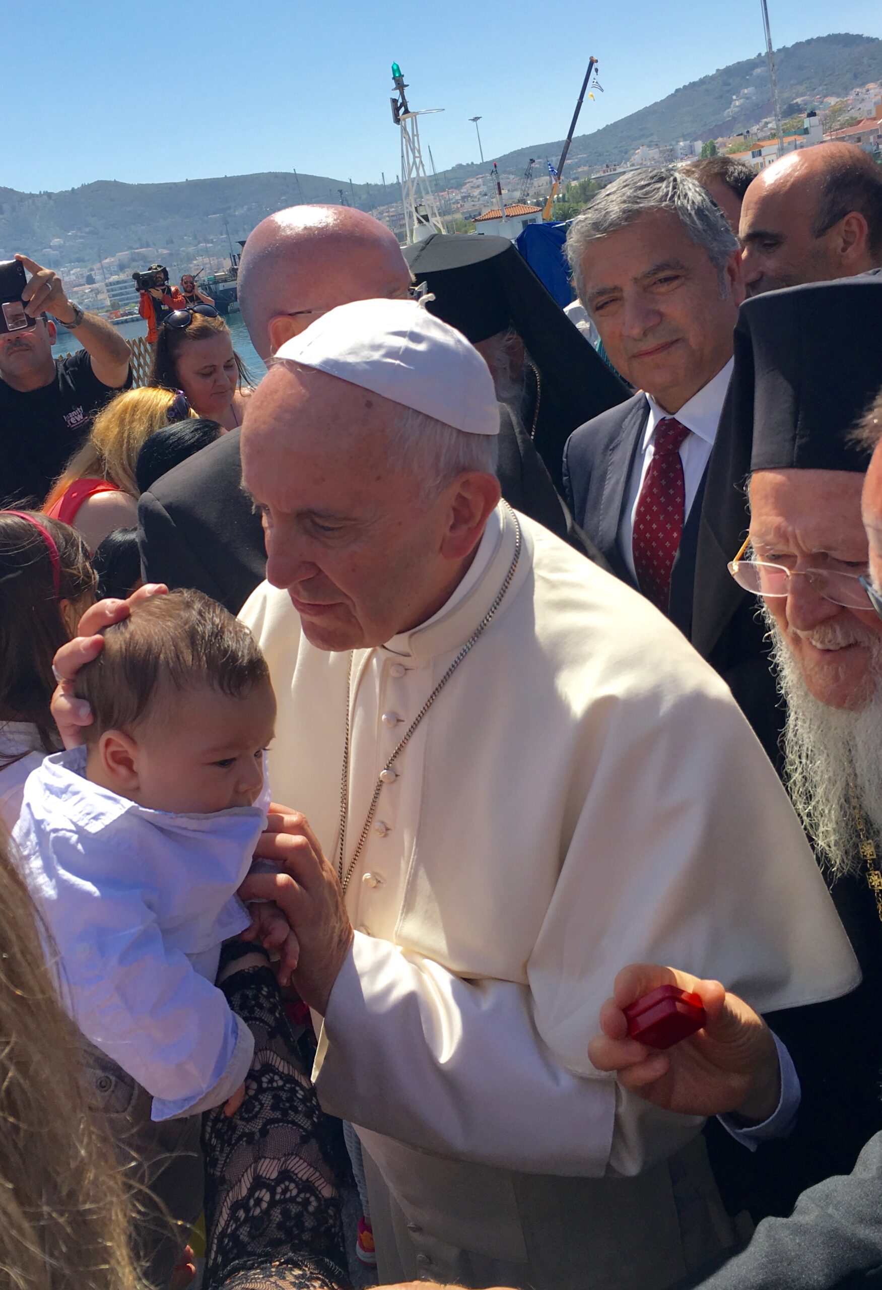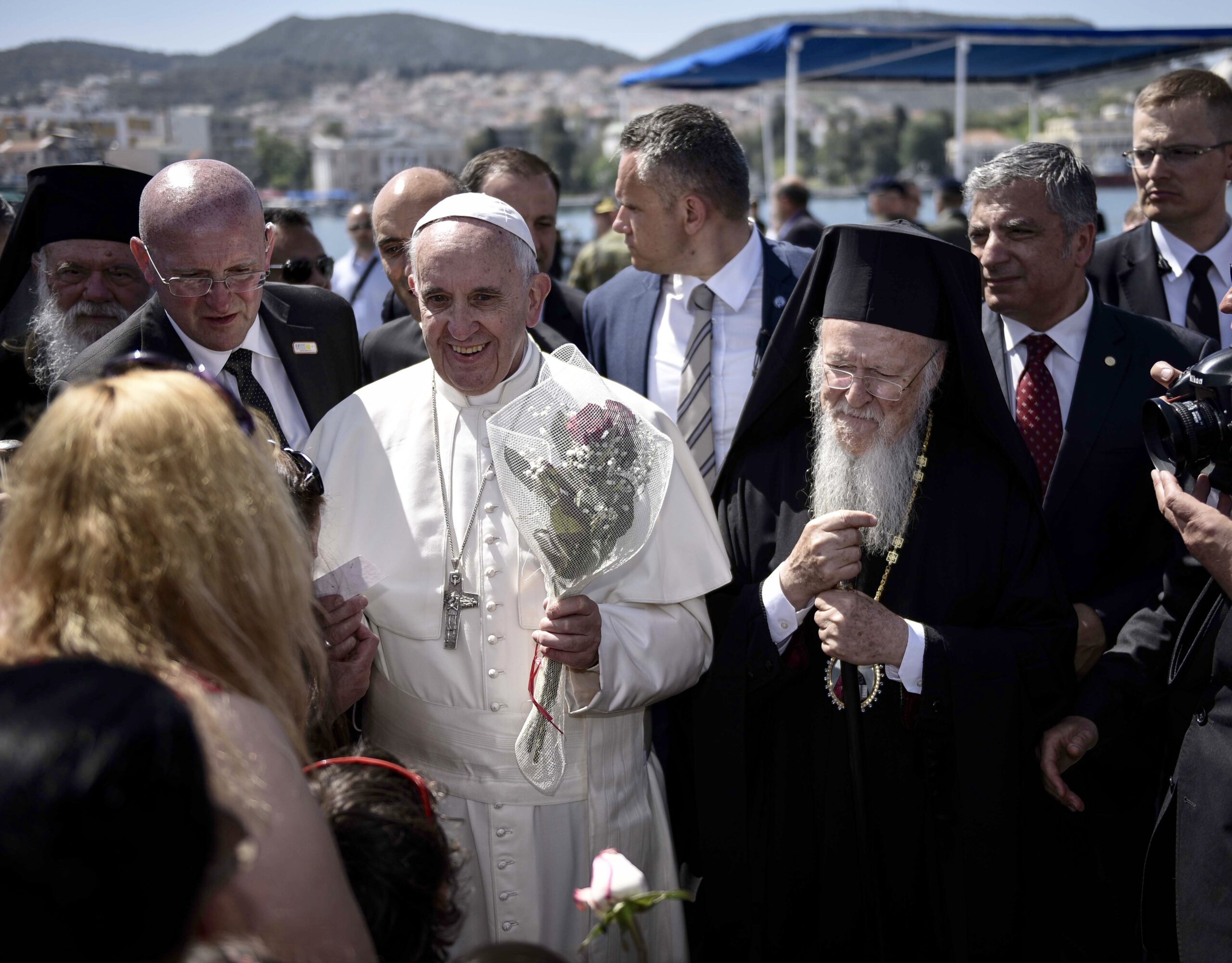 Τον Πάπα Φραγκίσκο υποδέχθηκαν στη Λέσβο ο  Οικουμενικός Πατριάρχης κ.κ. Βαρθολομαίος, ο Μακαριότατος  Αρχιεπίσκοπος Αθηνών και πάσης Ελλάδος κ. Ιερώνυμος και ο  Πρωθυπουργός κ. Αλέξης Τσίπρας.