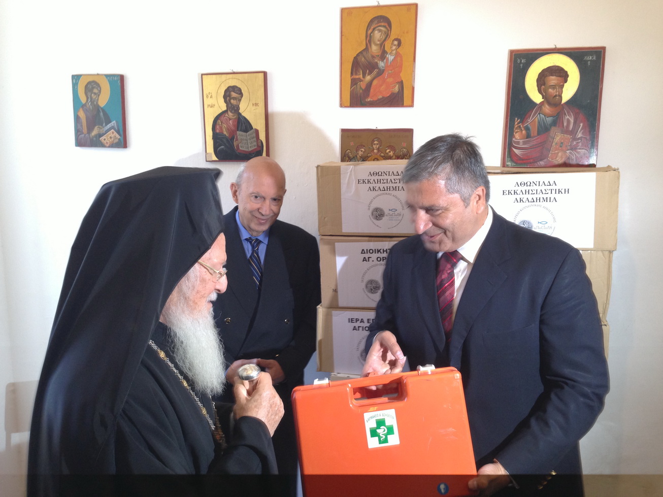Με την ευλογία του Οικουμενικού Πατριάρχη Κωνσταντινουπόλεως κ.κ. Βαρθολομαίου παρέδωσε σήμερα ιατροφαρμακευτικό υλικό στην Αθωνιάδα Εκκλησιαστική Ακαδημία του Αγίου Όρους ο Πρόεδρος του Ιατρικού Συλλόγου Αθηνών και Δήμαρχος Αμαρουσίου Γ. Πατούλης.