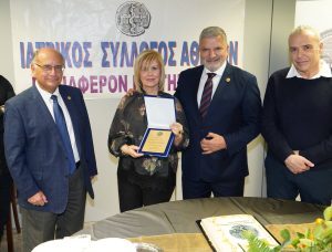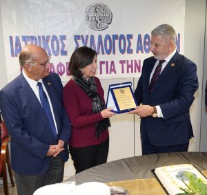 Στο πλαίσιο της εκδήλωσης, ο ΙΣΑ απένειμε τιμητικές πλακέτες σε δύο στελέχη του Συλλόγου, την Προϊσταμένη Γραμματείας και Δημοσίων Σχέσεων κυρία Χάρις Τσώνη και στην Προϊσταμένη Οικονομικών Υπηρεσιών κυρία Αγγελική Κώνστα, ως αναγνώριση της πολυετούς προσφοράς, της αφοσίωσης και της ουσιαστικής συμβολής τους στο έργο και τη λειτουργία του Ιατρικού Συλλόγου Αθηνών.
