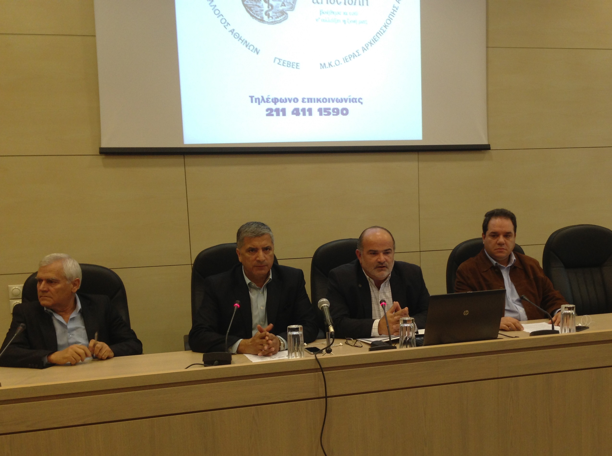 Ο Γ.Γραμματέας της ΓΣΕΒΕΕ, ο Πρόεδρος του ΙΣΑ, ο Πρόεδρος της ΓΣΕΒΕΕ και ο Διευθυντής της Αποστολής στ Συνέντευξη Τύπου για την ιδρυση Παραρτήματος του Ιατρείου Κοινωνικής Αποστολής στη ΓΣΕΒΕΕ