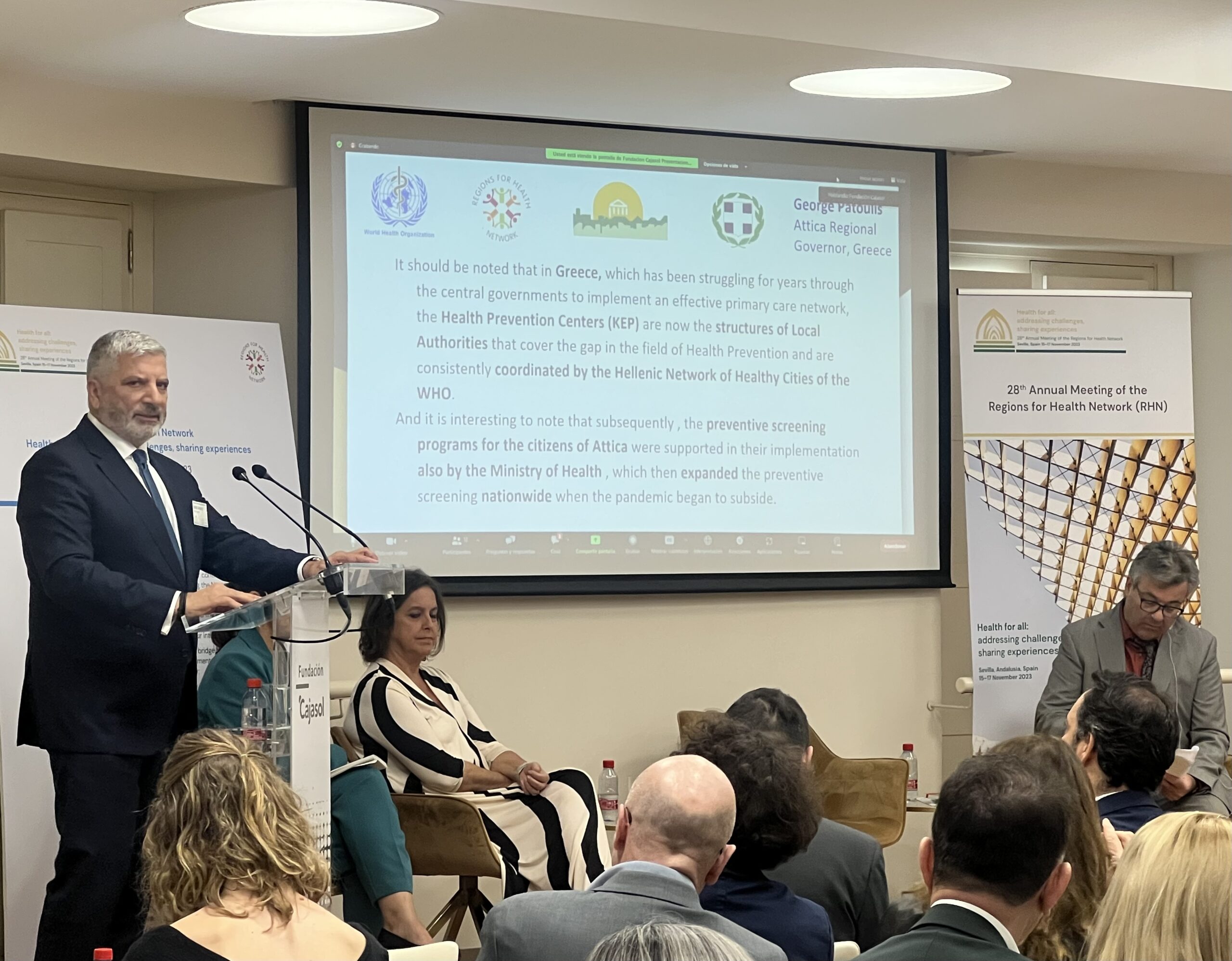 Κεντρικός ομιλητής στην εναρκτήρια ενότητα της 28ης ετήσιας τριήμερης συνάντησης του Ευρωπαϊκού Δικτύου των Περιφερειών για την Υγεία του ΠΟΥ, που διεξάγεται στην Σεβίλλη, ήταν ο Πρόεδρος του ΙΣΑ και Περιφερειάρχης Αττικής Γιώργος Πατούλης. Χαιρετίζοντας την έναρξη των εργασιών, που συμπίπτει με τη συμπλήρωση 30 ετών από τη σύσταση του Δικτύου, η Υπουργός Υγείας της Ανδαλουσίας Catalina García Carrasco και η σύμβουλος πολιτικών υγείας του Ευρωπαϊκού Γραφείου για την Επενδύσεις και την ανάπτυξη της Υγείας του ΠΟΥ Bettina Menne, καλωσόρισαν την Περιφέρεια Αττικής ως το νεότερο μέλος του, εξαίροντας την προσπάθεια που έχει γίνει τα τελευταία χρόνια από τη διοίκηση για την ενίσχυση της δημόσιας υγείας, καθώς και για τις δράσεις που αποσκοπούν στην αντιμετώπιση της κλιματικής κρίσης και των επιπτώσεών της στην υγεία των πολιτών. Ως την έμπρακτη επιβράβευση των προσπαθειών της Περιφέρειας Αττικής για την παροχή υψηλής ποιότητας υπηρεσιών υγείας σε όλους τους πολίτες χαρακτήρισε την ένταξη της Αττικής στο Δίκτυο πριν από έναν χρόνο ο κ. Πατούλης, κάτι που όπως τόνισε «είχαμε θέσει ως στόχο από την πρώτη ημέρα της ανάληψης των καθηκόντων μας, δεδομένου ότι, ήδη από το 2010 έχουμε δημιουργήσει το Ελληνικό Διαδημοτικό Δίκτυο Υγιών Πόλεων, του οποίου έχω την τιμή να προεδρεύω». Ο Πρόεδρος του ΙΣΑ έκανε ιδιαίτερη μνεία στα προγράμματα προσυμπτωματικού ελέγχου που υλοποιήθηκαν όλα αυτά τα χρόνια από τον ΕΔΔΥΠΠΥ, τα οποία όπως τόνισε, αποτελούν και τις βασικές δομές Υγείας όλης της Τοπικής Αυτοδιοίκησης. Αναφερόμενος στην πρωτόγνωρη συνθήκη που δημιούργησε η πανδημική κρίση, ο κ. Πατούλης υπογράμμισε τον σημαίνοντα ρόλο των Περιφερειών στην αντιμετώπισή της, καθώς και στις οργανωμένες δράσεις της Περιφέρειας Αττικής προς αυτή την κατεύθυνση, με την παροχή 150 εκ. ευρώ για τη μισθοδοσία επικουρικού ιατρικού και νοσηλευτικού προσωπικού, την ενίσχυση των δομών υγείας με εξοπλισμό και οχήματα, την διενέργεια διαγνωστικών ελέγχων σε όλη την Αττική, τη διανομή δωρεάν προστατευτικού υλικού, τη λειτουργία 24ωρης τηλεφωνικής γραμμής στήριξης, αλλά και την πολύπλευρη στήριξη των ευάλωτων κοινωνικών ομάδων, πρωτοβουλίες που δημιούργησαν ένα ισχυρό δίχτυ προστασίας για τους πολίτες. Ιδιαίτερη αναφορά έκανε επίσης και στις δράσεις για την ανάσχεση των επιπτώσεων της κλιματικής κρίσης στη δημόσια υγεία, με τη δημιουργία ενός υπερσύγχρονου συντονιστικού κέντρου έγκαιρης πρόγνωσης φυσικών κινδύνων, καθώς και του γεωπληροφοριακού διαδικτυακού συστήματος σε συνεργασία με το ΕΚΠΑ και το Εθνικό Αστεροσκοπείο. Ολοκληρώνοντας την ομιλία του, ο κ. Πατούλης υπογράμμισε ότι «υστέρα από τέσσερα χρόνια απανωτών κρίσεων, απειλών και κινδύνων, η Αττική τα κατάφερε, να έχει συνεισφέρει με ουσία, έργα και πράξεις στην υποστήριξη της υγείας των πολιτών εν μέσω της δραματικής εξουθένωσης του Εθνικού Συστήματος Υγείας της χώρας, το οποίο η κυβέρνηση αγωνιωδώς αγωνίζεται να ανατάξει» και πρόσθεσε: «Κυρίως , πέτυχε η Αττική να είναι σήμερα μέλος του Δικτύου Περιφερειών για την Υγεία του ΠΟΥ, σε έναν κόσμο που κανείς, στις μέρες μας, δεν επιβιώνει μόνος». Το Δίκτυο Περιφερειών για την Υγεία του ΠΟΥ είναι ένας αναπτυσσόμενος οργανισμός που αποτελείται από Περιφέρειες, συνεργαζόμενα μέλη και μέλη – κράτη του ΠΟΥ, με στόχο να βελτιώσει τις παρεχόμενες υπηρεσίες υγείας και ευεξίας για 