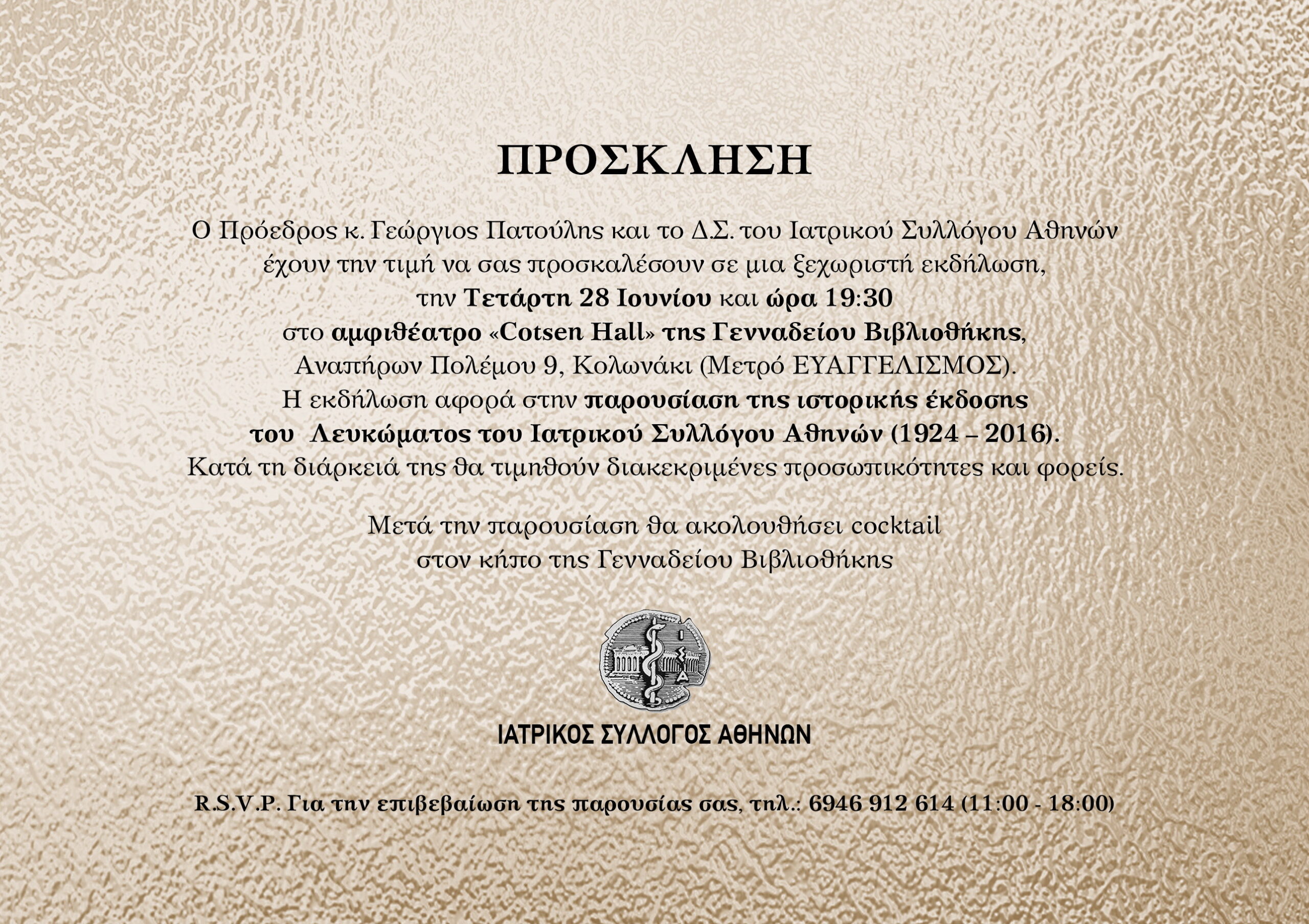 Μια σημαντική εκδήλωση, για την παρουσίαση της έκδοσης του ιστορικού Λευκώματος του Ιατρικού Συλλόγου Αθηνών 1924-2016,πρόκειται να πραγματοποιηθεί την Τετάρτη 28 Ιουνίου και ώρα 19:30 στο αμφιθέατρο “Cotsen Hall” της Γενναδείου Βιβλιοθήκης, Αναπήρων Πολέμου 9, Κολωνάκι (Μετρό ΕΥΑΓΓΕΛΙΣΜΟΣ). Στο Λεύκωμα αποτυπώνεται η πολυσχιδής δράση του Ιατρικού Συλλόγου Αθηνών, που ξεκίνησε στις αρχές του περασμένου αιώνα και συνεχίζεται μέχρι σήμερα. «Προχωρήσαμε στην έκδοση του «Ιστορικού Λευκώματος του Ιατρικού Συλλόγου Αθηνών 1924 – 2016», γιατί θέλουμε να τιμήσουμε την ιστορική διαδρομή επιστημονικής και κοινωνικής προσφοράς του ΙΣΑ και μέσα από αυτήν τιμούμε όχι μόνον τον Σύλλογο μας, αλλά και τον κάθε ιατρό ξεχωριστά, που ασκούσε και ασκεί ακόμη και σήμερα, παρά τις δύσκολες συνθήκες, με αυταπάρνηση το ιατρικό του λειτούργημα», σχολίασε ο πρόεδρος του ΙΣΑ Γ. Πατούλης. Στο πλαίσιο της εκδήλωσης πρόκειται να γίνει απονομή τιμητικών διακρίσεων σε προσωπικότητες που έχουν διακριθεί για το έργο τους. Σημειώνεται ότι σε όλους τους παρευρισκόμενους πρόκειται να διατεθεί το λεύκωμα.