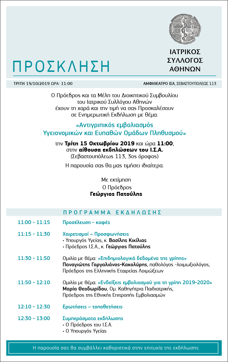 O Πρόεδρος Γ.Πατούλης και το ΔΣ του Ιατρικού Συλλόγου Αθηνών σας καλούν σε Ενημερωτική Εκδήλωση, με θέμα τον «Αντιγριπικό Εμβολιασμό Υγειονομικών και Ευπαθών Ομάδων του Πληθυσμού», στο πλαίσιο της οποίας θα παρουσιαστούν τα επιδημιολογικά δεδομένα για τον ιό της γρίπης.