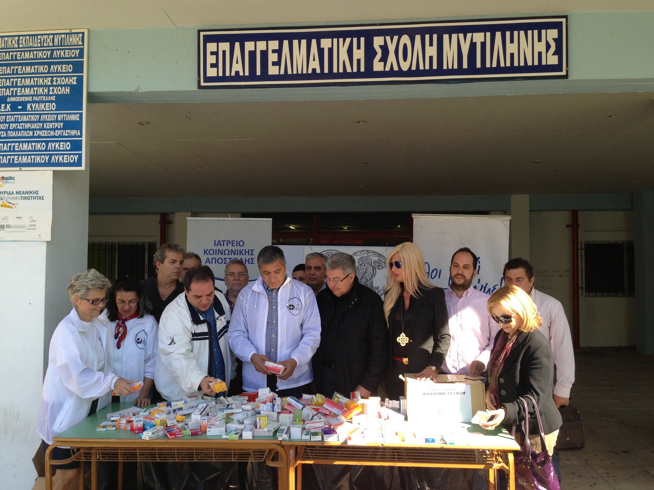 Με το μήνυμα «Όλοι μαζί μπορούμε και στην Υγεία» το Ιατρείο Κοινωνικής Αποστολής και ο ΣΚΑΙ συγκέντρωσαν φάρμακα στη Μυτιλήνη μαζί με την Ανώτατη Σχολή Τεχνολογικής και Παιδαγωγικής Εκπαίδευσης Β.Αιγαίου, η οποία σήμερα ξεκινάει επίσημα τη λειτουργία της. Στη συγκέντρωση των φαρμάκων που πραγματοποιήθηκε στην Επαγγελματική Σχολή Μυτιλήνης συμμετείχαν ο Πρόεδρος του Ιατρικού Συλλόγου Αθηνών Γιώργος Πατούλης, ο Διευθυντής της Αποστολής της Ιεράς Αρχιεπισκοπής Αθηνών Κωστής Δήμτσας, ο Πρόεδρος της Ανώτατης Σχολής Τεχνολογικής και Παιδαγωγικής Εκπαίδευσης (ΑΣΠΑΙΤΕ), Γιάννης Χρυσουλάκης, η φιλόλογος και συνεργάτης της ΑΣΠΑΙΤΕ Μαρίνα Σταυράκη-Πατούλη και ο υπεύθυνος δημοσίων σχέσεων της ΑΠΟΣΤΟΛΗΣ Γιάννης Πεταλάς. Τον Πρόεδρο του ΙΣΑ συνόδευαν η εθελόντρια Παιδίατρος του Ιατρείου Κοινωνικής Αποστολής Ελένη Μελιάδου και η εθελόντρια Καλλιόπη Περρέα. Τα φάρμακα και το υγειονομικό υλικό που συγκεντρώθηκε, συμπλήρωσαν 8 μεγάλους σάκους, οι οποίοι παρελήφθησαν από το Δίκτυο «ΑΓΛΑΛΙΑ» για τη δημιουργία του Κοινωνικού Φαρμακείου της Καλλονής Λέσβου, το οποίο όπως τόνισε ο εκπρόσωπος του Δικτύου Πατερ Ευστράτιος θα λειτουργεί με εθελοντές γιατρούς και φαρμακοποιούς της καλλονής και θα εξυπηρετεί τους εμπερίστατους ανασφάλιστους κατοίκους του νησιού. Η δράση στηρίχθηκε από τον Ιατρικό Σύλλογο Λέσβου. Το Ιατρείο Κοινωνικής Αποστολής συνεχίζει την πανελλαδική προσπάθεια, στην οποία πρωταγωνιστής είναι ο κάθε απλός και ανώνυμος πολίτης που κάθε Σάββατο βρίσκεται κοντά μας. Στο Ιατρείο Κοινωνικής Αποστολής καθημερινά προσέρχονται 300-400 ασθενείς και λαμβάνουν δωρεάν το φάρμακό τους βάσει ιατρικής συνταγής του θεράποντα γιατρού τους. Από 1η Οκτωβρίου 2013, στο Κοινωνικό Φαρμακείο του Ιατρείου λαμβάνουν δωρεάν τα φάρμακά τους και όλοι οι ανασφάλιστοι ασθενείς που συμμετέχουν στο πρόγραμμα του Voucher Υγείας. Παράλληλα, στηρίζει τα Κοινωνικά Φαρμακεία Δήμων, μητροπόλεων και άλλων φορέων σε όλη την Ελλάδα, με συνέχεια, συνέπεια και αγάπη προς κάθε εμπερίστατο πολίτη της Ελλάδας.
