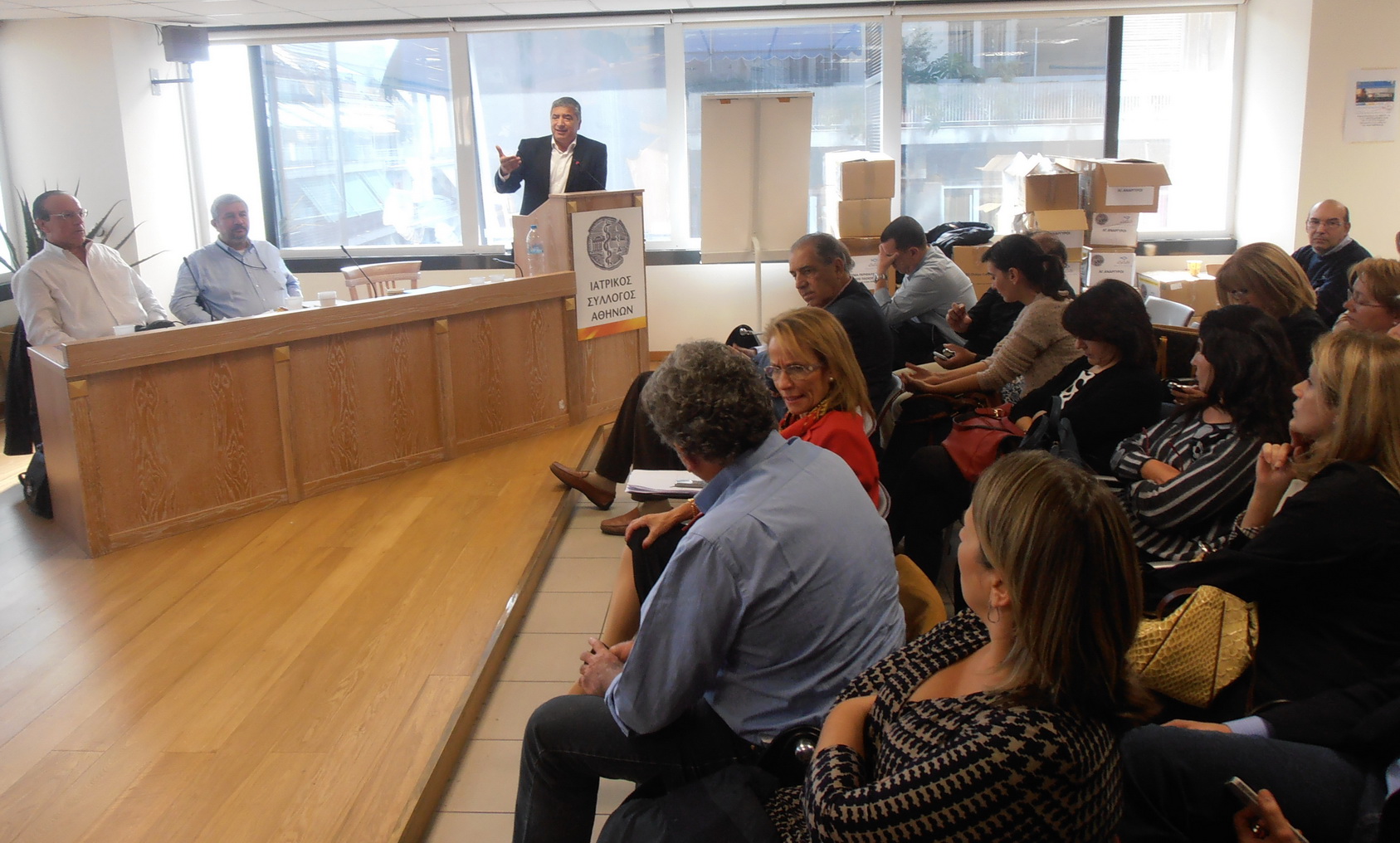 Στη Γενική Συνέλευση της ΠΕΕΒΙ ο Πρόεδρος του ΙΣΑ Γ.Πατούλης στο βήμα, ο Πρόεδρος του ΠΙΣ Μ.Βλασταράκος και η Προεδρος του ΙΣΠ Β.Ανεμοδουρά, η Πρόεδρος του ΙΣ Πατρών Α.Μαστοράκου, ο Πρόεδρος του ΙΣ Κορίνθου Π.Παπαναγιώτου και πλήθος γιατρών μελων της ενωσης