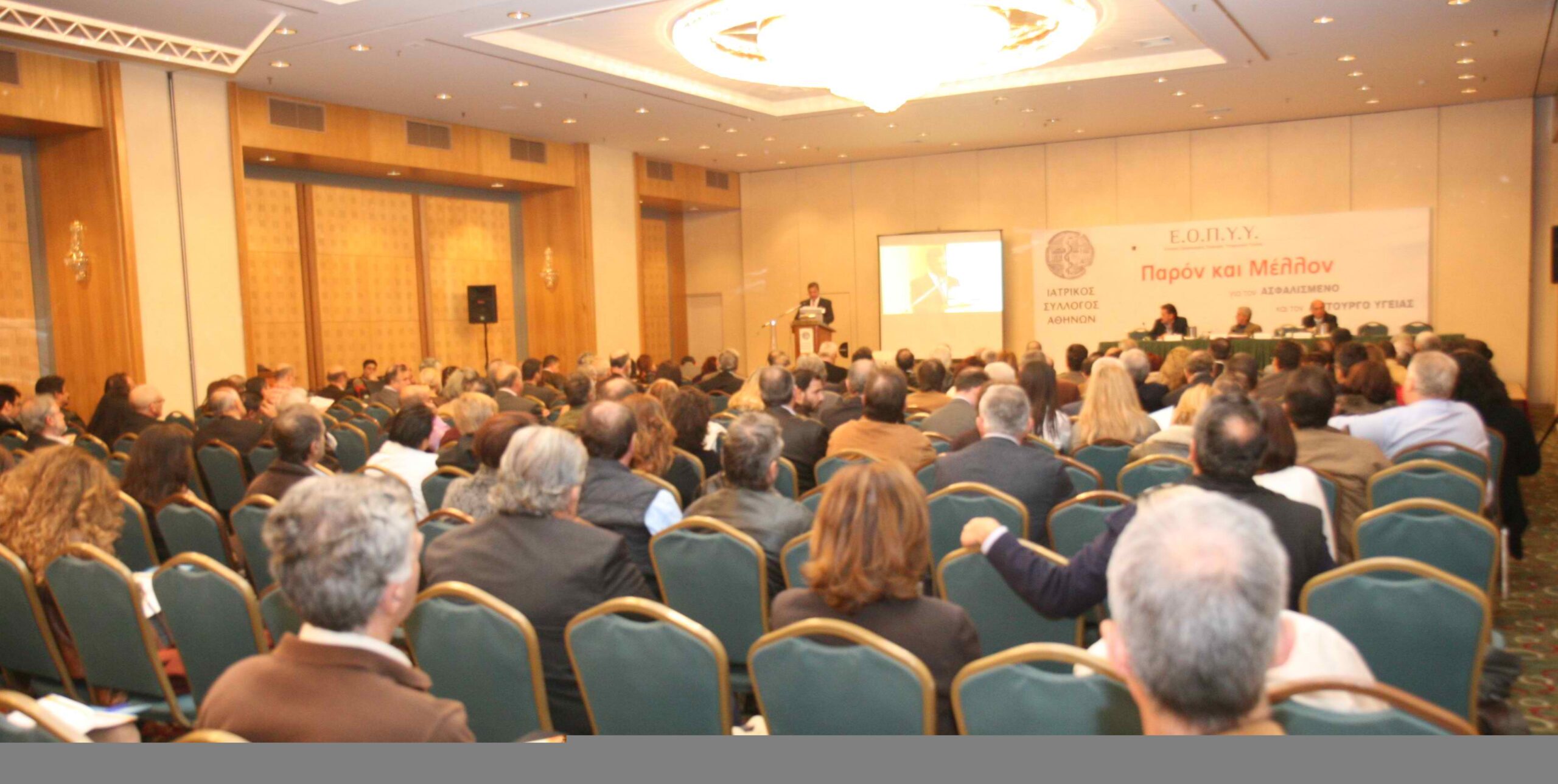 Κατά την έναρξη της ημερίδας, εκ μέρους της Πολιτείας χαιρετισμό απηύθυναν οι εκπρόσωποι του Γραφείου Υφυπουργού κ. Μπόλαρη, -προκαλώντας αίσθηση το γεγονός της παντελούς απουσίας πολιτικού εκπροσώπου του Υπουργείου Υγείας-, ο πρώην Υφυπουργός Υγείας και Τομεάρχης Υγείας της Νέας Δημοκρατίας Αθανάσιος Γιαννόπουλος, ο βουλευτής του Κ.Κ.Ε, ιατρός, Νικόλαος Παπακωνσταντίνου, ο εκπρόσωπος της Δημοκρατικής Αριστεράς, ιατρός, Γιώργος Μπουλμπασάκος. Από μέρους του Δ.Σ του Ιατρικού Συλλόγου Αθηνών, χαιρετισμό απηύθυναν για τη Δημοκρατική Κίνηση Ιατρών (ΔΗ.Κ.Ι) ο Ευστάθιος Τσούκαλος, για την Πανελλήνια Συνδικαλιστική Κίνηση Γιατρών (ΠΑ.Σ.Κ-Γ) ο Νικόλαος Μπατάκης, για τη Δημοκρατική Πανεπιστημονική Κίνηση Γιατρών (ΔΗ.ΠΑ.Κ-Γ) ο Θεόδωρος Πιτσόλης, για την Ιατρική Συνεργασία για την Υγεία (ΙΑ.Σ.Υ) ο Εμμανουήλ Ζαχαριάδης, για την Κίνηση Ιατρικής Αναβάθμισης (Κ.Ι.ΑΝ) η Βιβή Τράσια, για την Ανεξάρτητη Ιατρική Κίνηση (Α.Ι.Κ) η Δέσποινα Μυλωνάκη, ενώ παρέμβαση έκανε ο εκπρόσωπος του Δ.Σ του Ι.Σ.Α της Αριστερής Ριζοσπαστικής Συνεργασίας Ιατρών (Α.Ρ.Σ.Ι) Σωτήριος Καλιαμπάκος. Ομιλητές της εκδήλωσης ήταν ο Πρόεδρος του Πανελλήνιου Φαρμακευτικού Συλλόγου Θεόδωρος Αμπατζόγλου, ο Πρόεδρος της Πανελλήνιας Ομοσπονδίας Συλλόγων Επιστημονικού Υγειονομικού Προσωπικού Ι.Κ.Α (Π.Ο.Σ.Ε.Υ.Π.Ι.Κ.Α) Μιχάλης Βλασταράκος, ο Πρόεδρος της Ένωσης Ιατρών Νοσοκομείων Αθήνας Πειραιά (Ε.Ι.Ν.Α.Π) και Γενικός Γραμματέας Δ.Σ του Ι.Σ.Α Ευστάθιος Τσούκαλος, ο Πρόεδρος της Ελληνικής Οδοντιατρικής Ομοσπονδίας Αθανάσιος Κατσίκης, ο Πρόεδρος της Ομοσπονδίας Συνταξιούχων Δημοσίων Υπαλλήλων Αττικής Παναγιώτης Βαβουγιός, ο Πρόεδρος της Ένωσης Ελευθεροεπαγγελματιών Ιατρών Αθηνών (Ε.Ε.Λ.Ι.Α) Ιωάννης Δατσέρης, ο Πρόεδρος της Ένωσης Ελευθεροεπαγγελματιών Καρδιολόγων, Αρχίατρος ΕΑ και μέλος Δ.Σ του Ι.Σ.Α Φώτης Πατσουράκος, ο Πρόεδρος της Πανελλήνιας Επαγγελματικής Ένωσης Εργαστηριακών Ιατρών Βιοπαθολόγων Ανάργυρος Πλακιώτης, ο Πρόεδρος του Τ.Σ.Α.Υ Μάριος Θεμιστοκλέους, ο τέως Πρόεδρος Ι.Σ.Α Σωτήριος Ρηγάκης, ο Αντιπρόεδρος Πανελλήνιας Ένωσης Φαρμακοβιομηχανίας Θεόδωρος Τρύφων, ο Οικονομολόγος ειδικός σε Θέματα Κοινωνικής Ασφάλισης Γεώργιος Ρωμανιάς, ο Γενικός Γραμματέας της Ένωσης Γενικής Ιατρικής Ευάγγελος Φραγκίσκος, ο Αντιπρόεδρος του Δ.Σ του Ι.Σ.Α Αχιλλέας Ρέντης, το μέλος του Δ.Σ Ι.Σ.Α Ανδρέας Θωμόπουλος, ο Συντονιστής Τ.Ε.Π. Σωτήριος Δρίτσας, ο Γενικός Διευθυντής Ζωής και Υγείας INTERAMERICAN Γιώργος Βελιώτης, ο Διευθυντής Πνευμονολογικής Κλινικής Εμμανουήλ Ζαχαριάδης, ο Κοσμήτορας Εθνικής Σχολής Δημόσιας Υγείας Ιωάννης Κυριόπουλος, ο Διευθυντής της Β’ Μ.Ε.Θ ΚΑΤ Ιωάννης Αλαμάνος, ο Επιμελητής Β’ Γενικής Ιατρικής Γιώργος Μαρίνος, ο Γενικός Επιχειρησιακός και Διοικητικός Διευθυντής Ιατρικού Κέντρου Βασίλειος Μπαρδής, ο Συντονιστής Διευθυντής Ακτινολογικού Τμήματος Γ.Ν. «Κοργιαλένειο – Μπενάκειο» Ε.Ε.Σ. Νικόλαος Μπατάκης, ο Διευθυντής ΕΣΥ-Γενικής Ιατρικής Νικόλαος Παπανικολάου, ο Δικηγόρος και Νομικός Σύμβουλος στο ΚΕΕΛΠΝΟ Χάρης Πολίτης, ο Γενικός Ιατρός – Διευθυντής Κέντρου Υγείας Νεμέας Ευστάθιος Σκληρός, ενώ αναγνώστηκε, λόγω απουσίας του, και χαιρετισμός του Γενικού Γραμματέα Γενικής Συνομοσπονδίας Εργατών Ελλάδας (Γ.Σ.Ε.Ε) Νικόλαος Κουτσιούκης. Στην εκδήλωση παρέστησαν ο πολιτευτής της Νέας Δημοκρατίας και ιατρός, Βασίλης Κικίλιας, ο Πρόεδρος του Ιατρικού Συλλόγου Πατρών Απόστολ