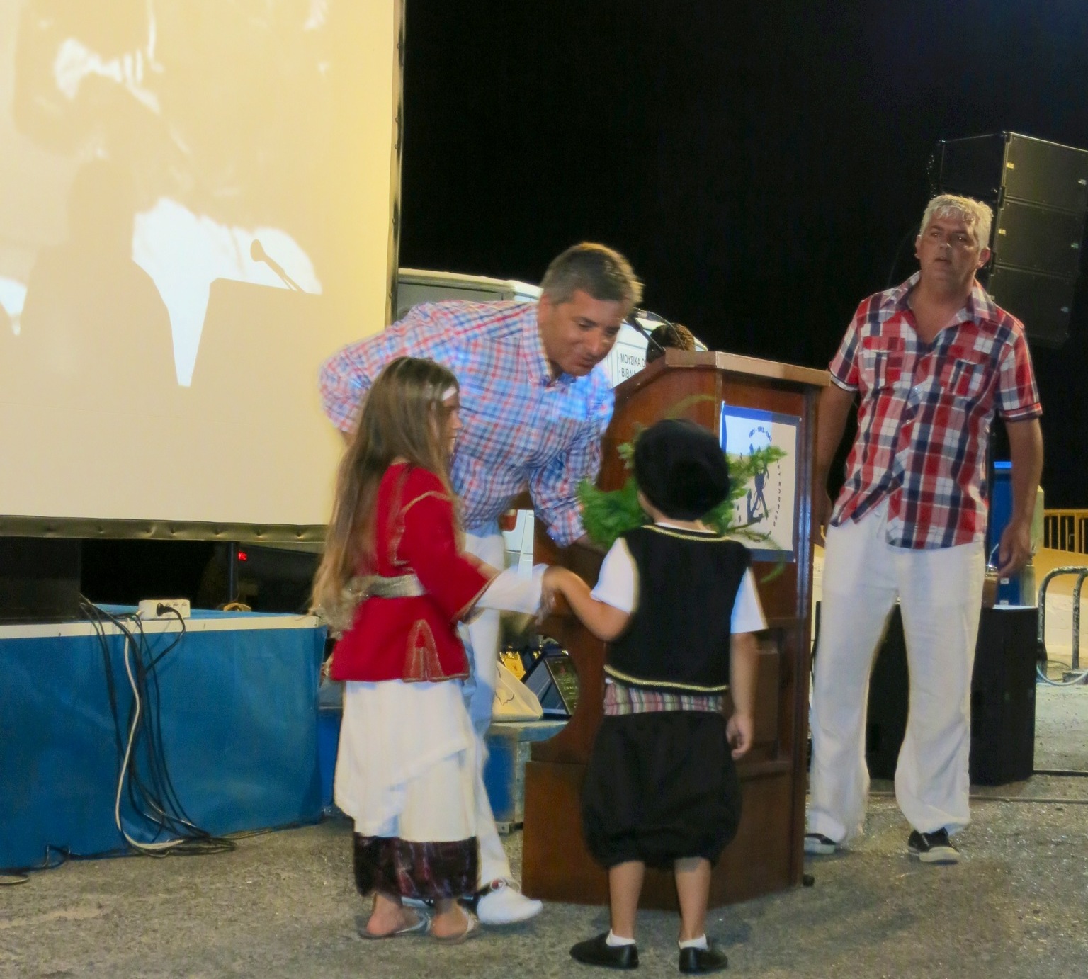 Ο Νίκος και η Εφραίμα προσφέρουν στον ομιλητή κο Πατούλη ανθοδέσμη, σύμβολο αγάπης και φιλίας